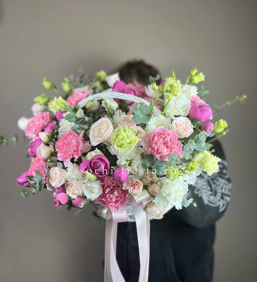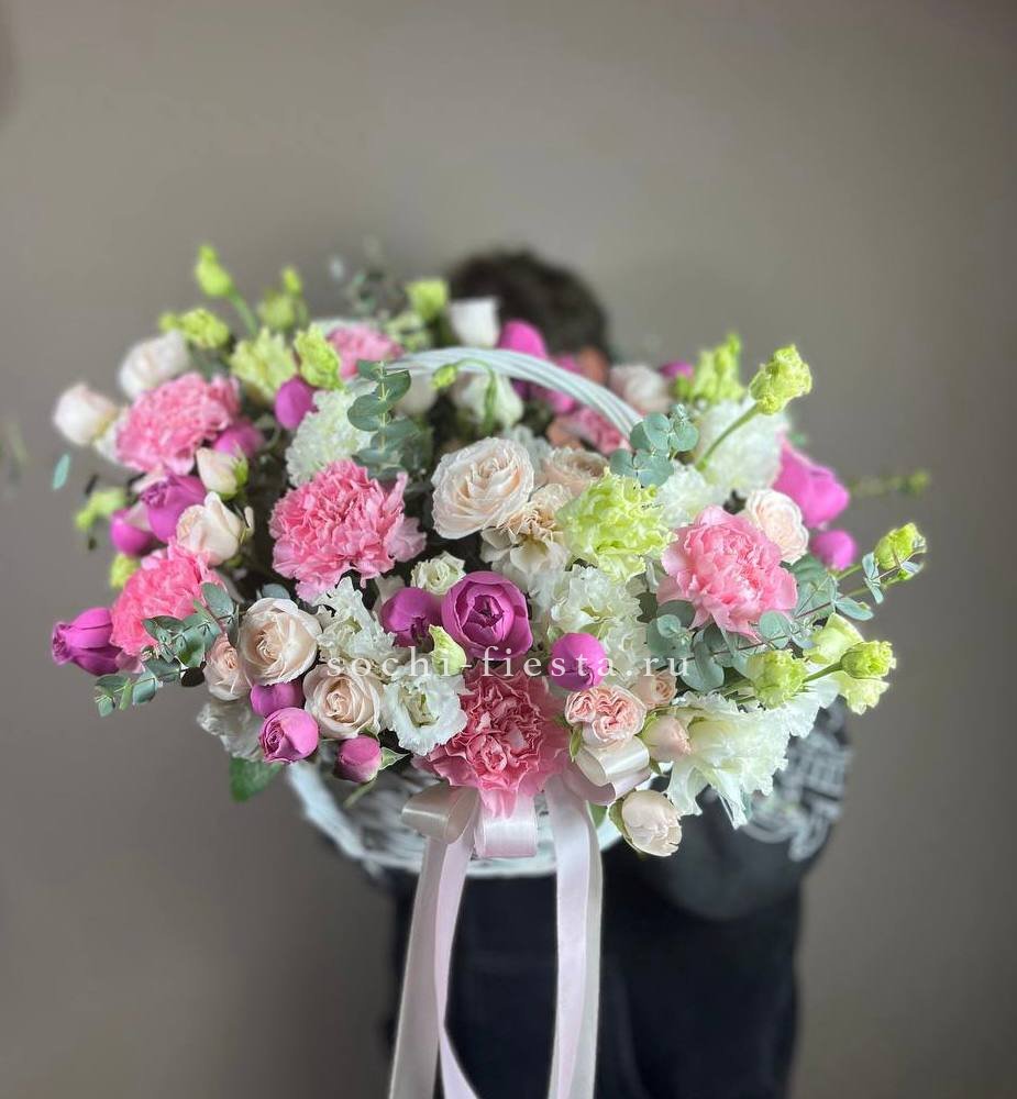 Плотная россыпь кустовых роз и эустомы создает живую текстуру с множеством мелких бутонов. Диантус добавляет воздушности, а эвкалипт собирает композицию в завершенную форму. Корзина позволяет разместить букет на столе без дополнительной вазы.