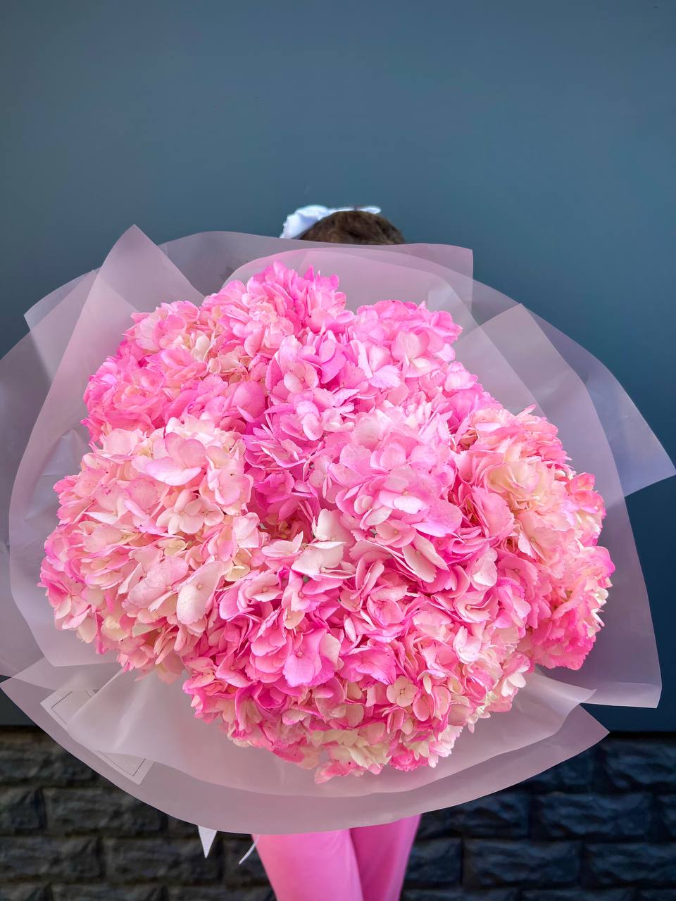 Двадцать пять соцветий гортензий разных оттенков формируют пышное облако с естественной игрой цвета. Каждая головка раскрывается по-своему, создавая живую фактуру без четких границ между тонами.
