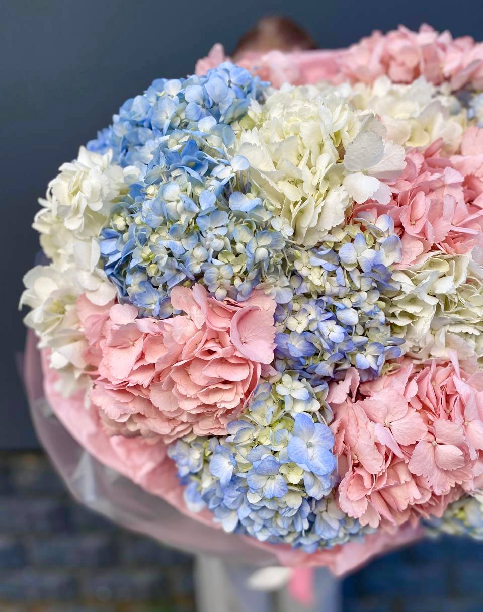 Пятнадцать соцветий гортензии образуют густую сферу с насыщенной глубиной цвета. Объёмная композиция заполняет пространство и притягивает внимание своей плотностью.