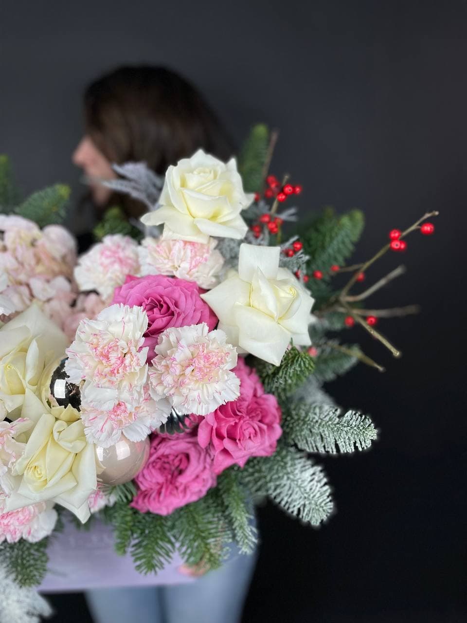 ветки датского нобилиса, пионовидные розы Country Blue, розы, диантусы, илекс, набор ёлочных украшений, квадратный бокс.