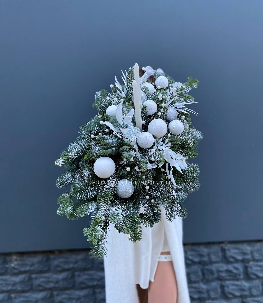 Низкая композиция с нобилисом и свечами создаёт камерное настроение вечера. Балерина добавляет лёгкости среди плотной хвои и блестящих игрушек.
