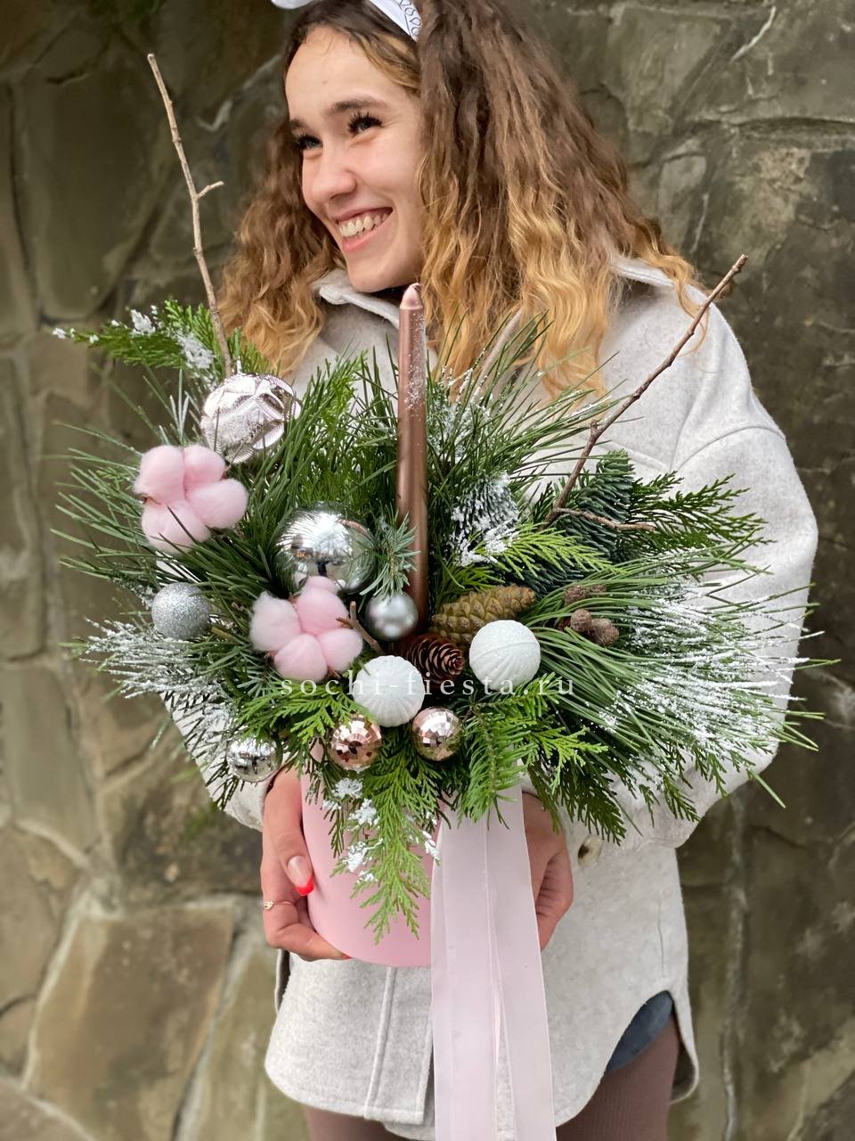 Новогодняя композиция в коробке пинк