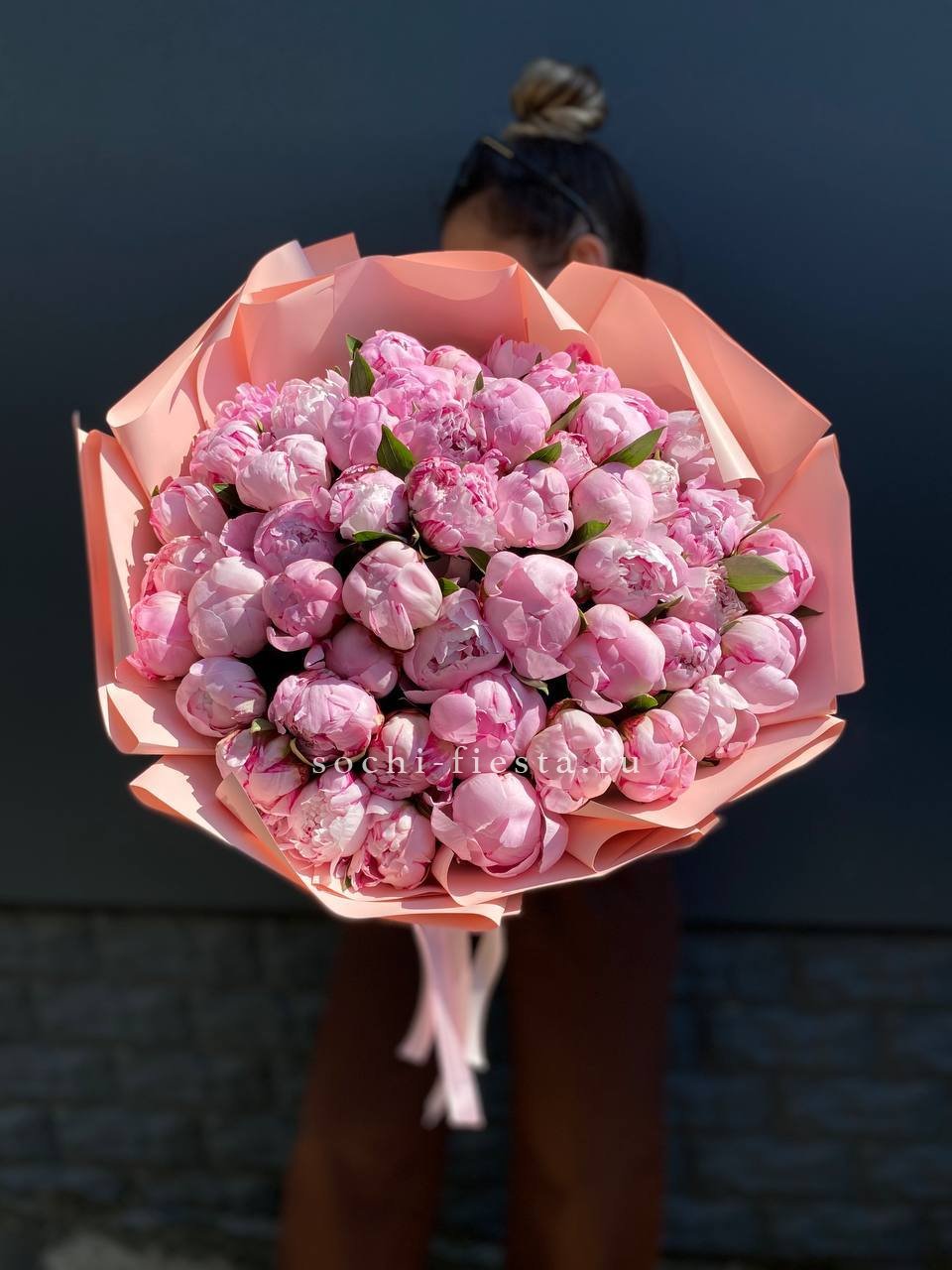 Пятьдесят один пион собраны в объёмную композицию, которая заполняет пространство цветом и ароматом.