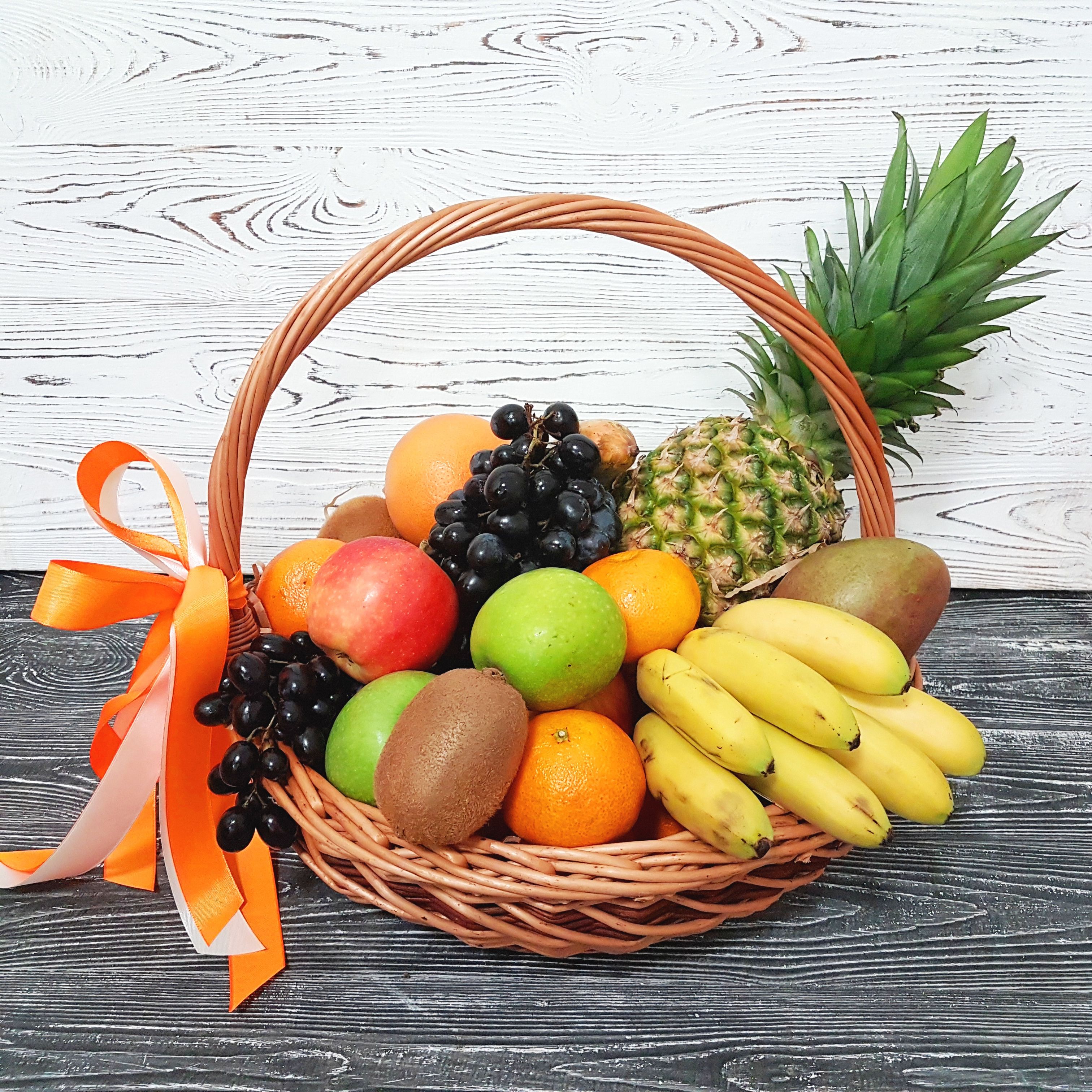Яркая палитра спелых фруктов собрана в плетеной корзине для тех, кто ценит натуральные вкусы. Ананас и виноград соседствуют с сочными цитрусовыми и зелеными киви, создавая живописную композицию.