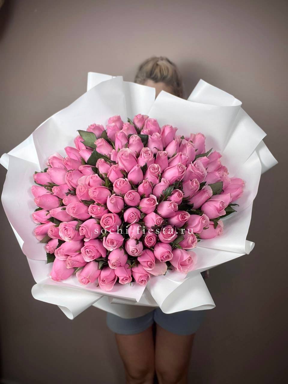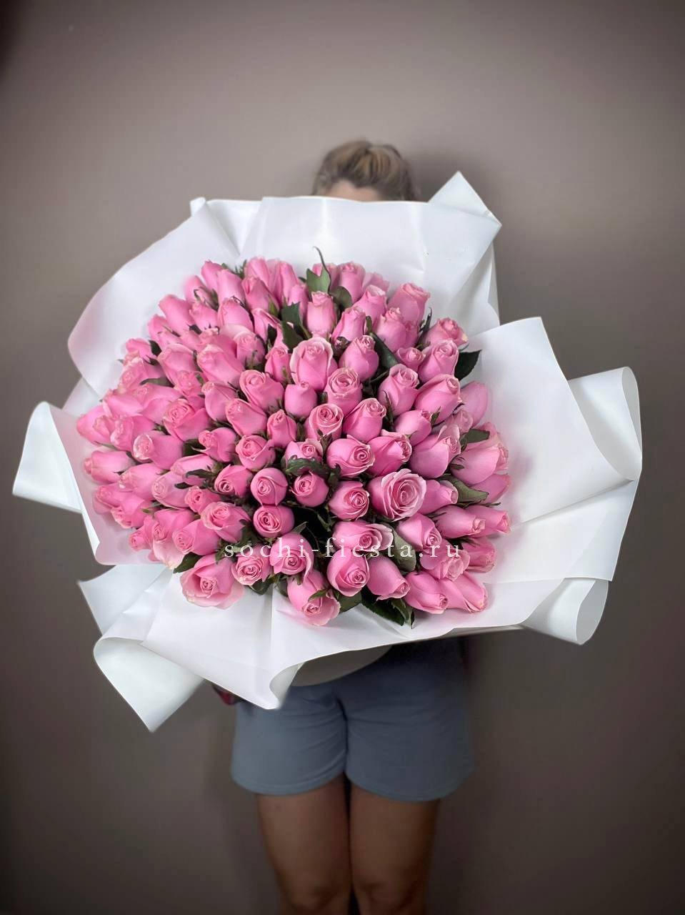 101 роза разноцветных оттенков, лента, упаковка на выбор.