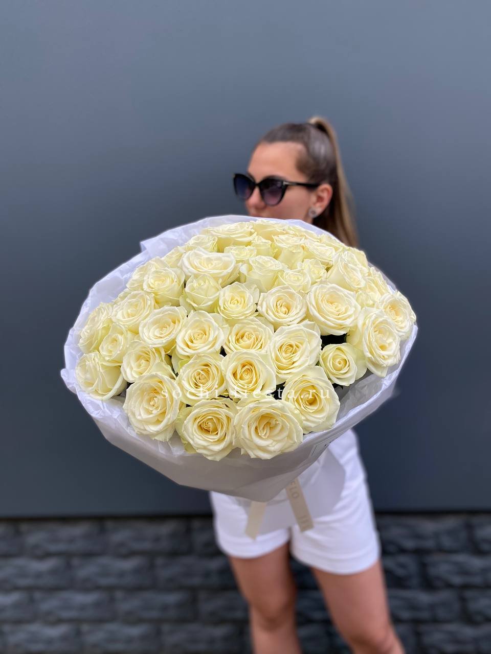 Белые розы собраны в плотную округлую форму с ровным силуэтом. Дизайнерская упаковка подчёркивает графичность линий и создаёт завершённую композицию. Букет с выразительным присутствием.