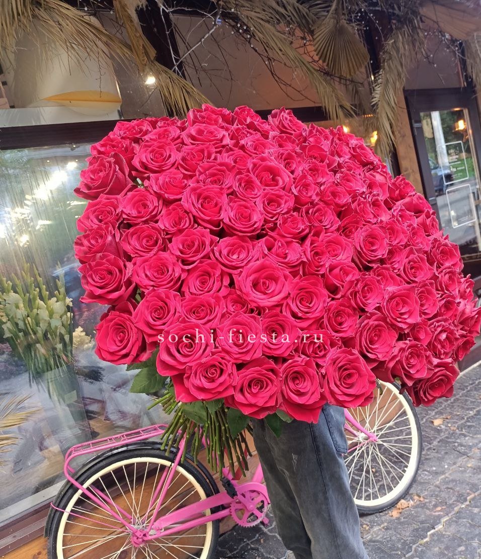 Сто одна голландская роза образует монументальную композицию. Красные бутоны выстраиваются в плотный объем, который невозможно не заметить и сложно забыть.