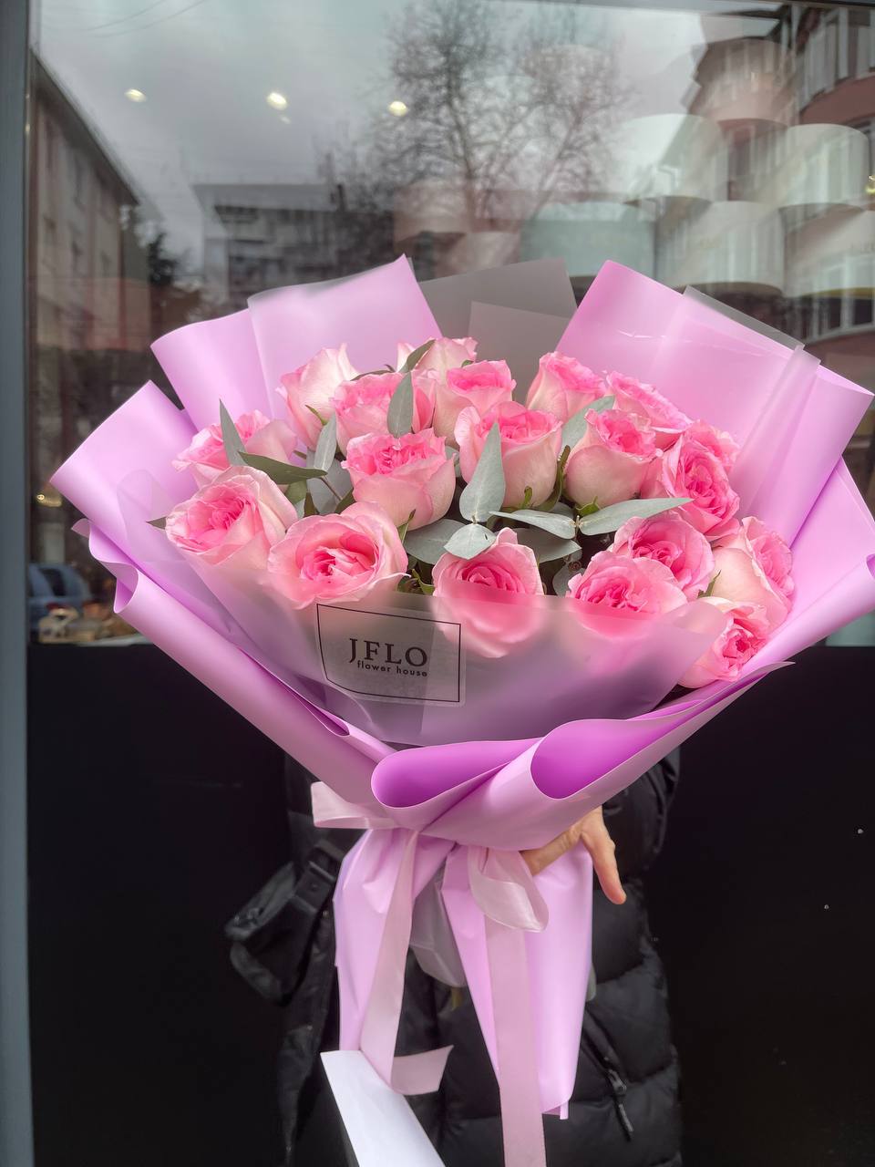 Девятнадцать бутонов раскрываются плавными волнами, создавая объёмную композицию с чёткими линиями. Розовый оттенок переходит от светлого к насыщенному, а эвкалипт добавляет воздушности между соцветиями. Букет держит форму и выглядит самодостаточно.