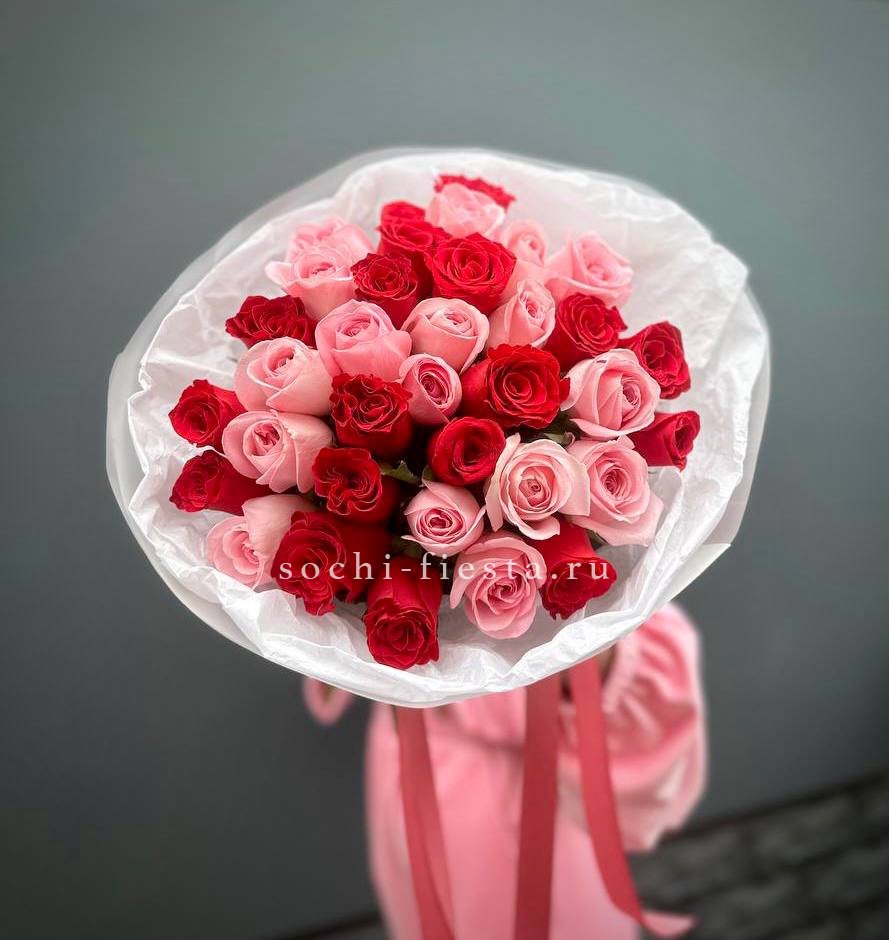 25 розовых роз, лента, дизайнерская упаковка.
