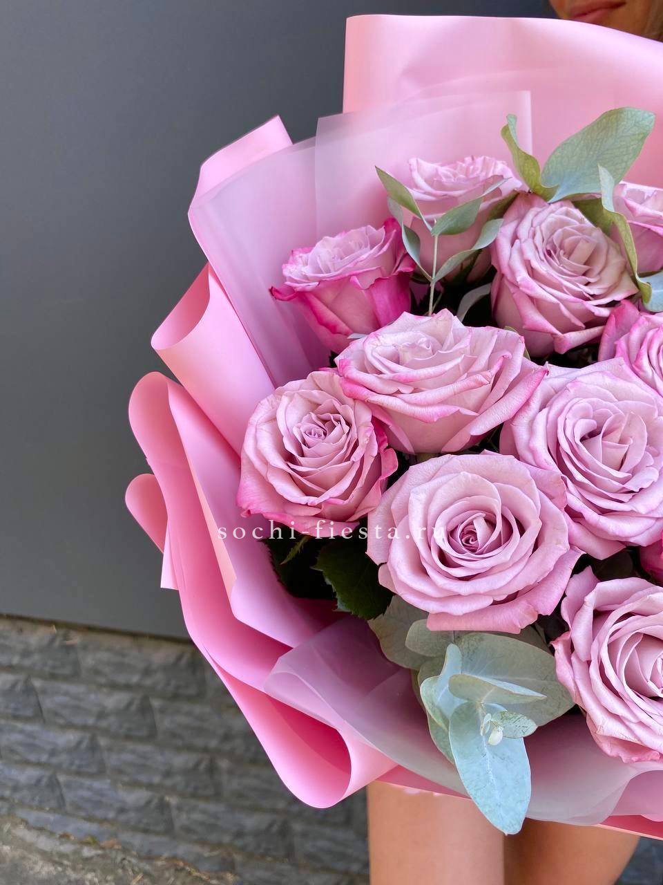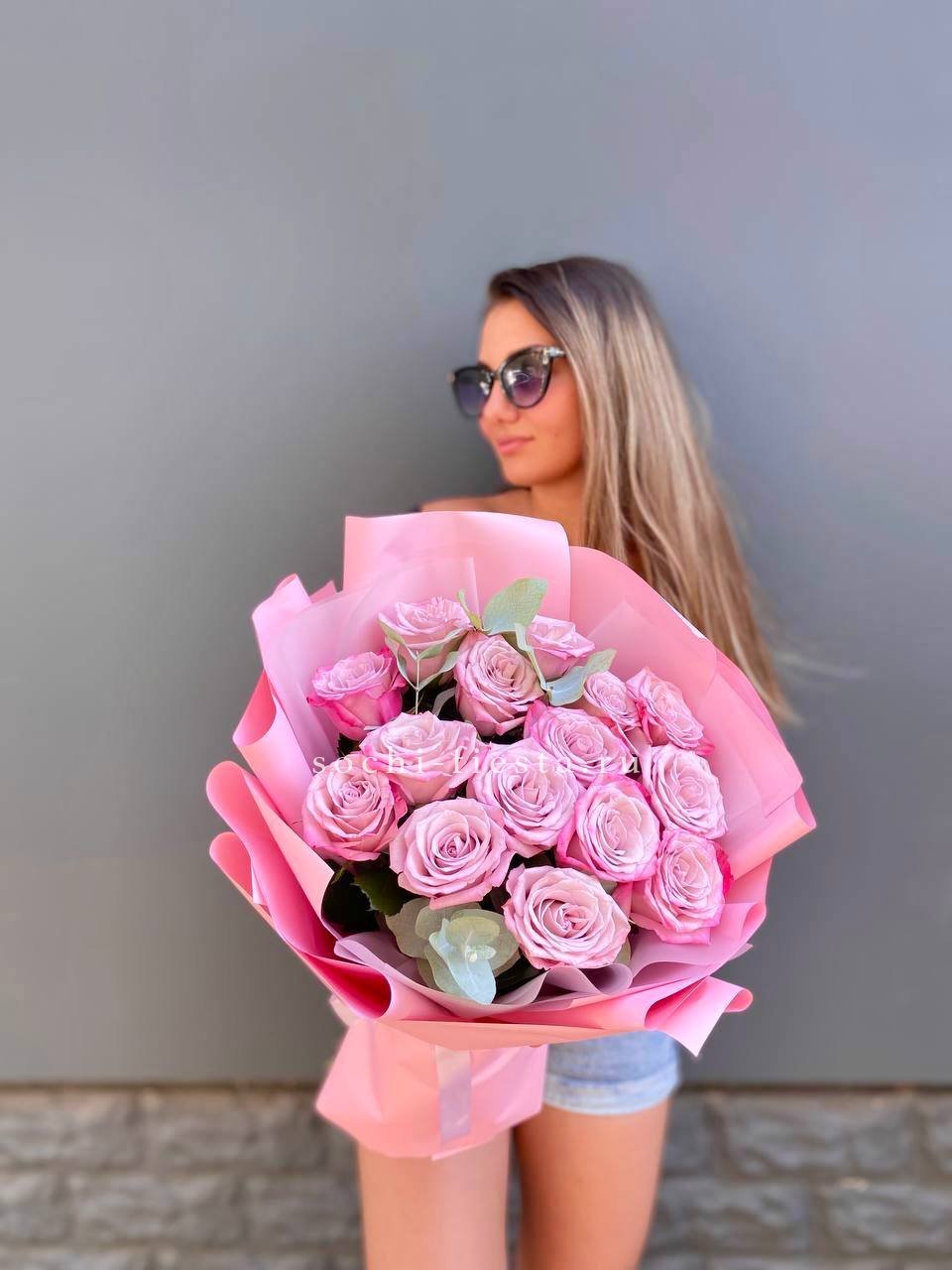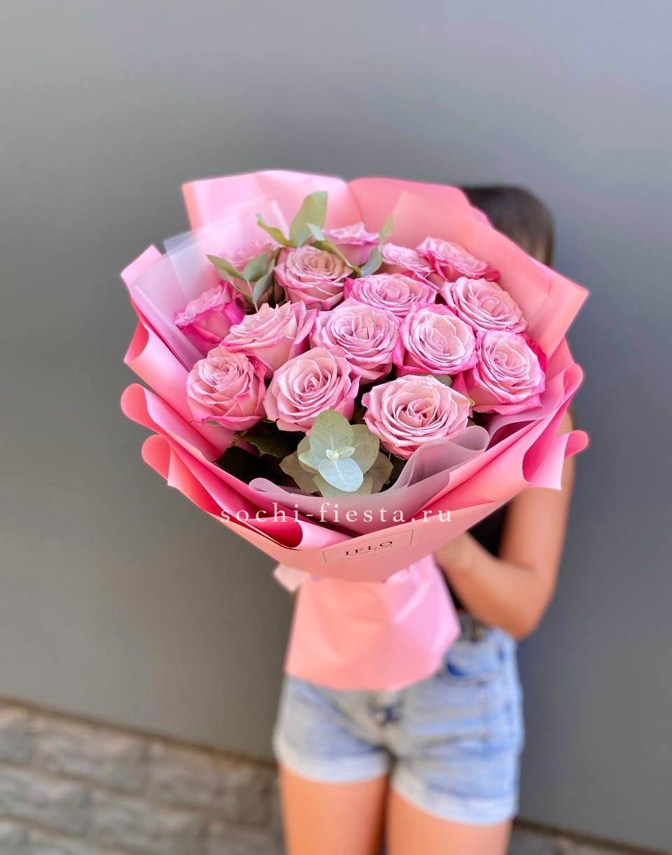 Классический розовый букет с мягкими переходами оттенков и свежей зеленью эвкалипта. Простая композиция подходит для спокойных встреч и тёплых моментов. Количество бутонов выбирается по желанию.