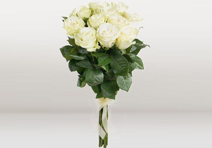 Одиннадцать белых бутонов в лаконичной сборке. Светлые головки роз раскрываются постепенно, сохраняя свежесть и аккуратность формы на протяжении долгого времени.