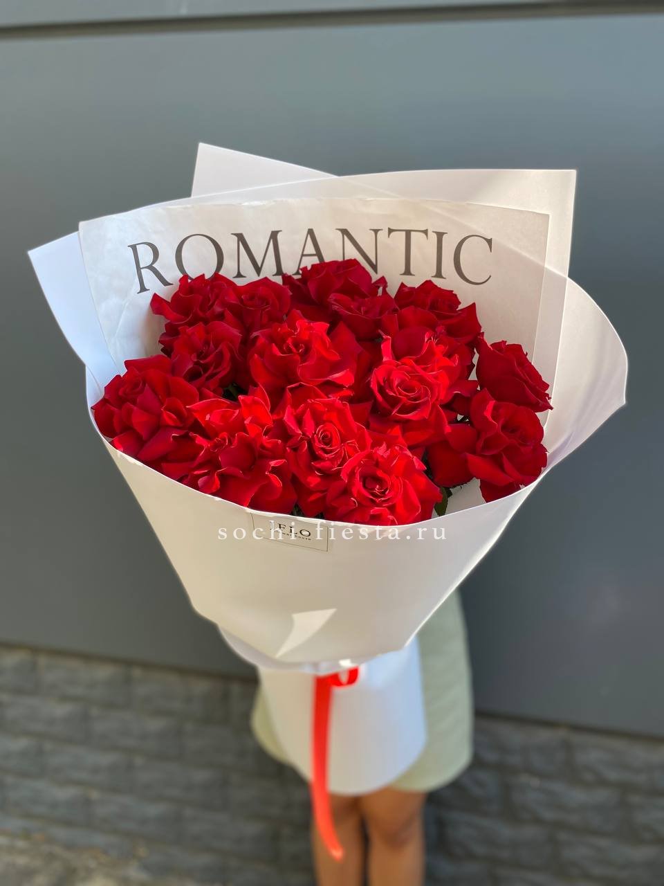 15 красных голландских роз 70 см, пленка, лента.