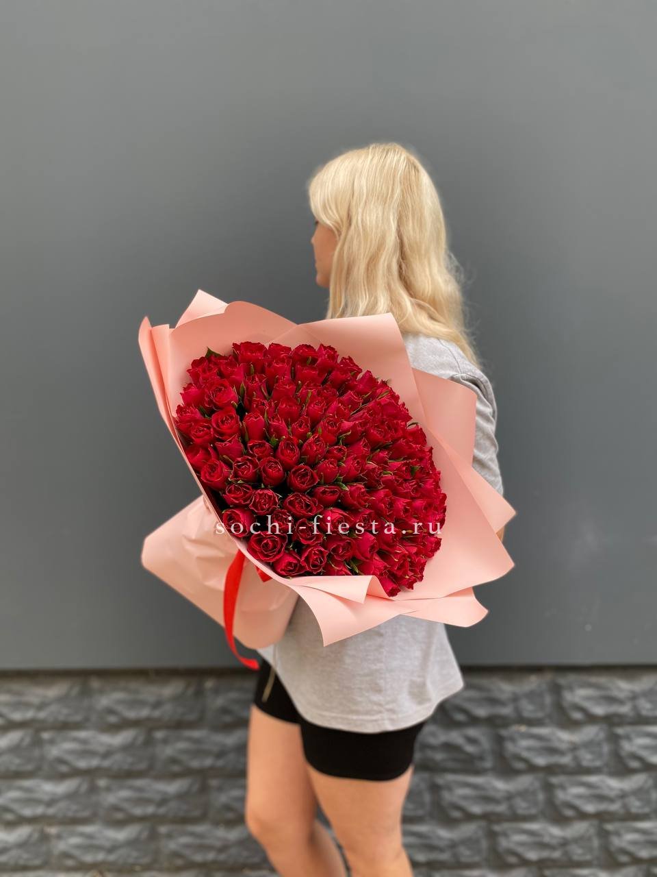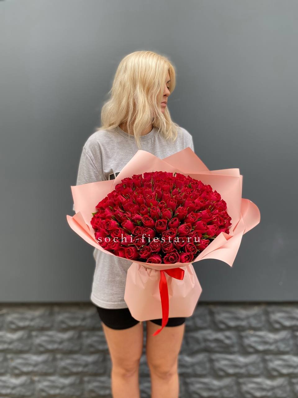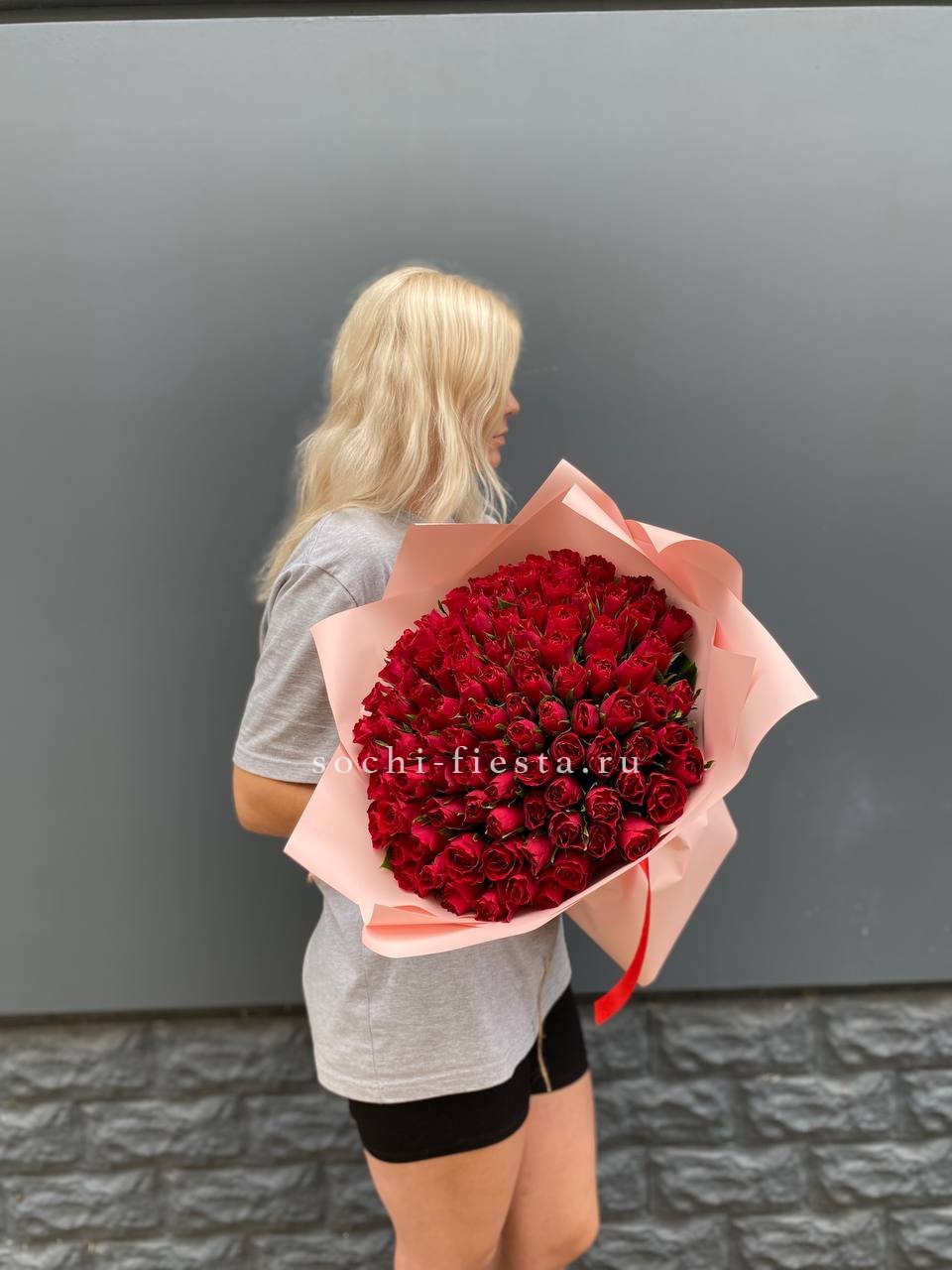 Сто одна красная роза хорошо сохраняет форму и долго радует свежестью бутонов. Плотная сборка обеспечивает аккуратный вид и удобство размещения в любом интерьере.