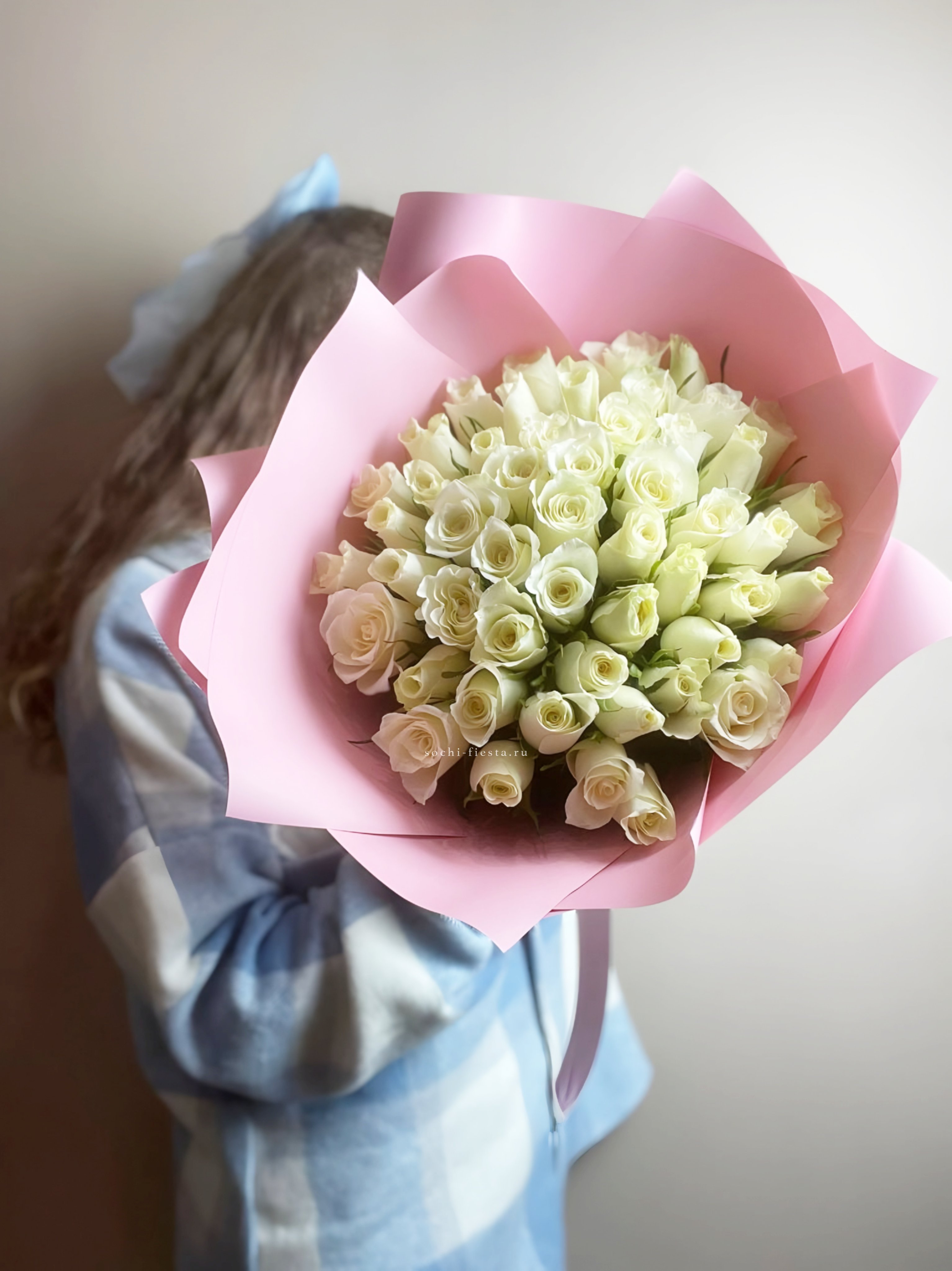 Белоснежные бутоны раскрываются ровными рядами, создавая чистую графичную форму. Пятьдесят один цветок образует объемную композицию, где каждая роза сохраняет свежесть и четкость линий. Букет для тех, кто ценит лаконичность.