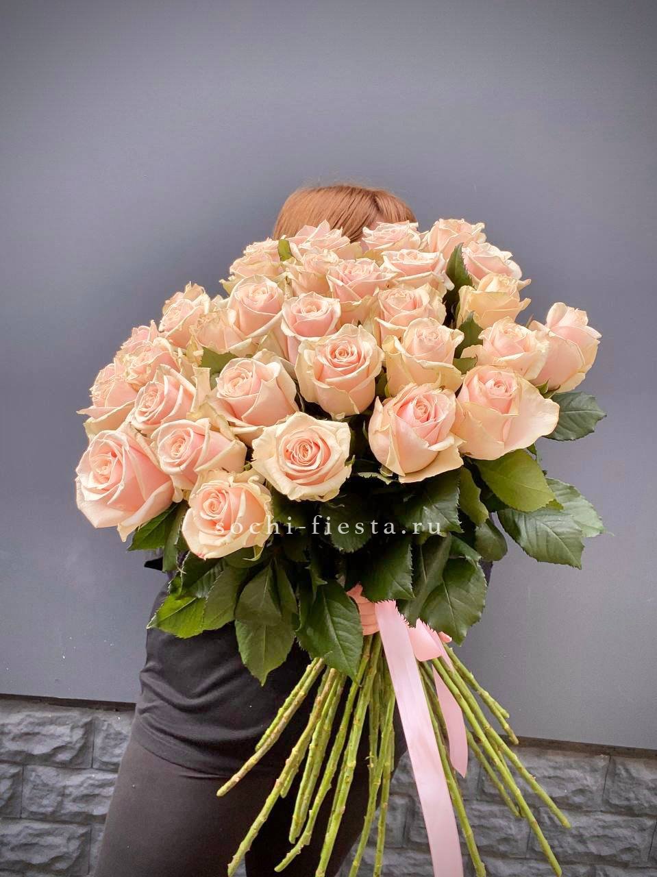 15 высоких кремовых роз, лента, упаковка на выбор.