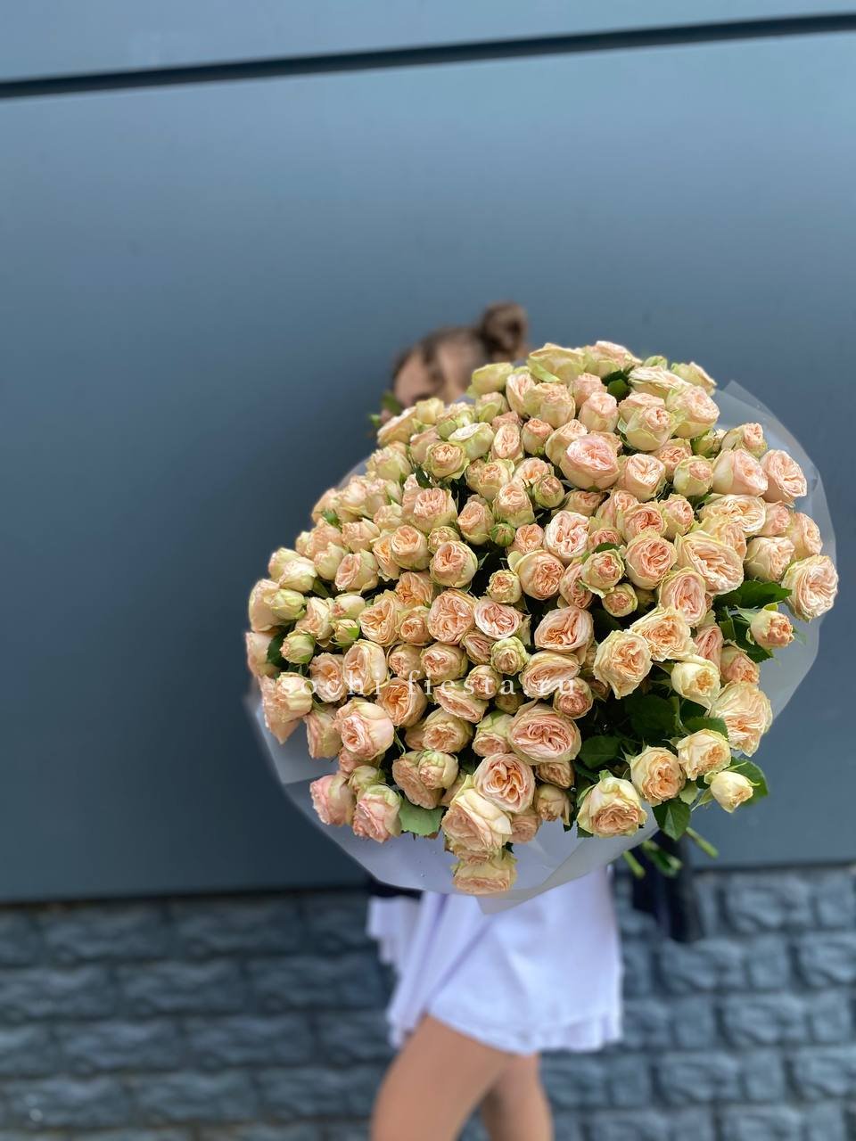 кустовая пионовидная роза, лента, дизайнерская упаковка.