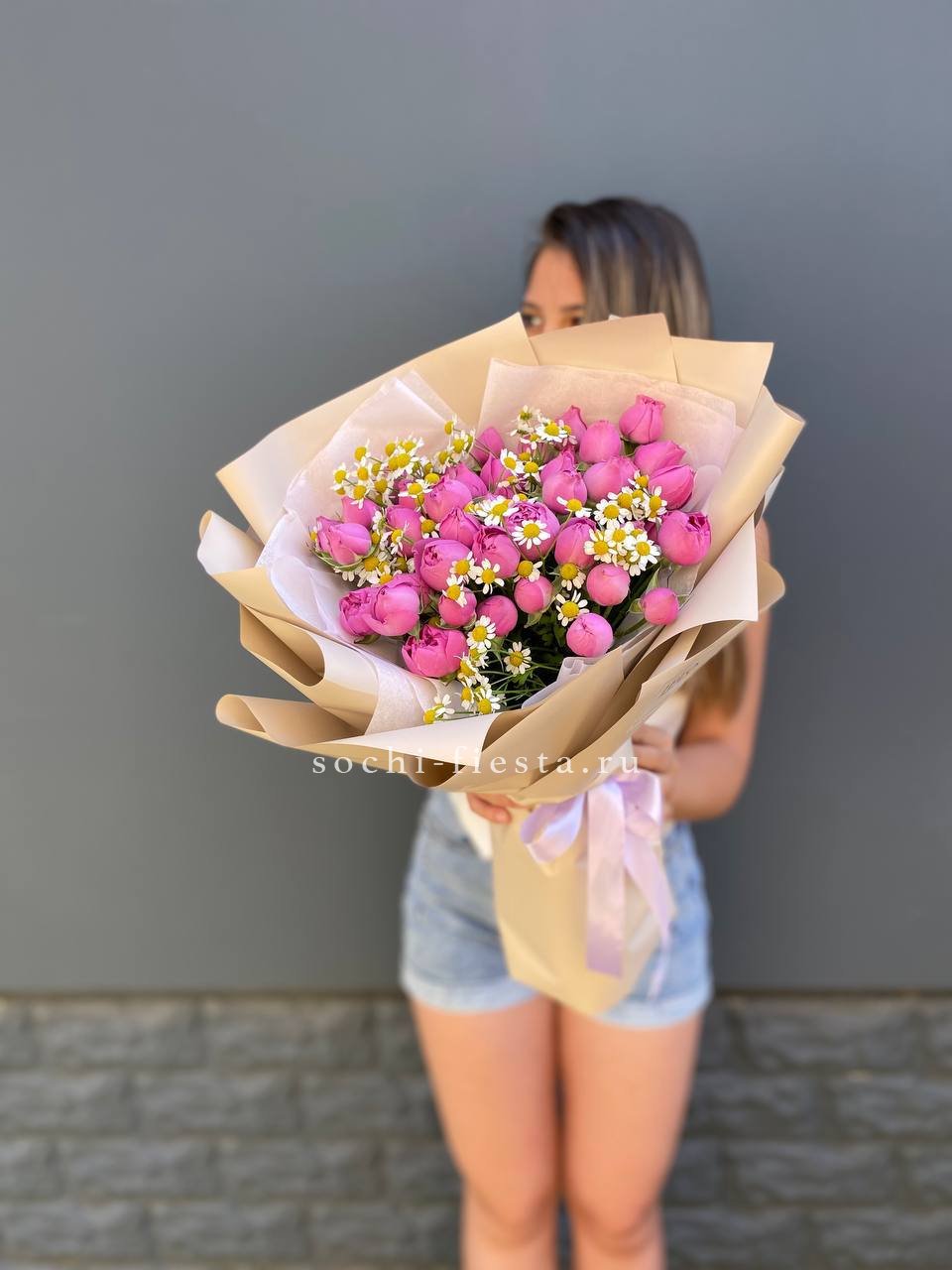 кустовые розы мисти бабблс, ромашки, лента, упаковка.