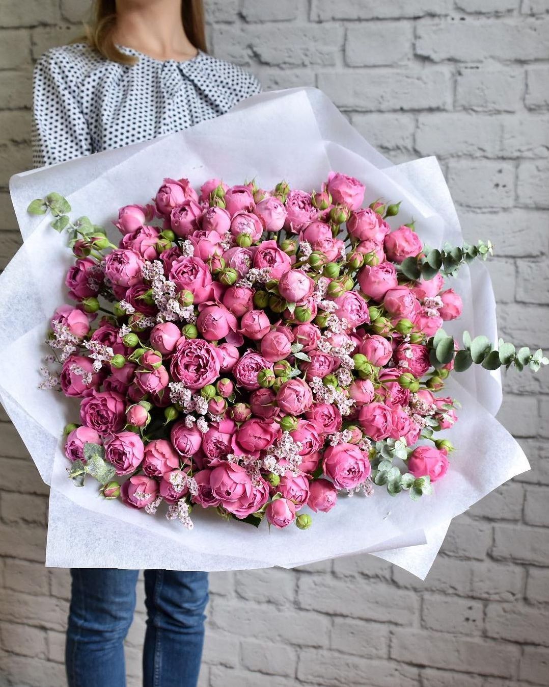 15 пионовидных кустовых роз в сиреневых или розовых оттенках, лента, крафт или другая упаковка на усмотрение заказчика.