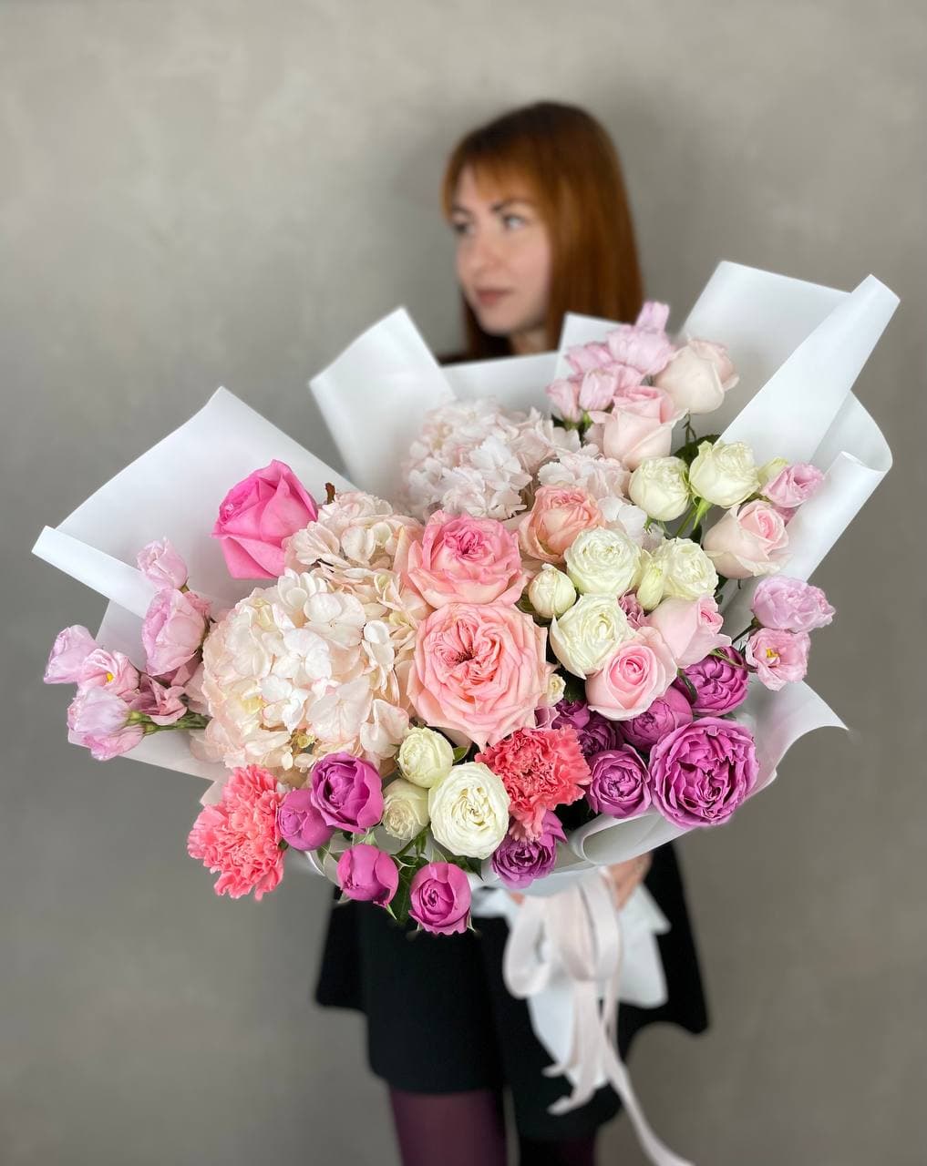 Летняя композиция объединяет диантусы, розы и гортензию в свободной форме. Эустома добавляет воздушности, а эвкалипт создает мягкий фон. Букет с характером теплого сезона и яркими акцентами.